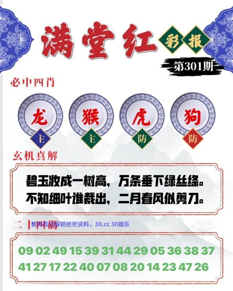 301期满堂红彩报:碧玉妆成一树高,万条垂下绿丝绦。不知细叶谁裁出,二月春风似剪刀。 六肖:猴狗马牛鸡龙 |