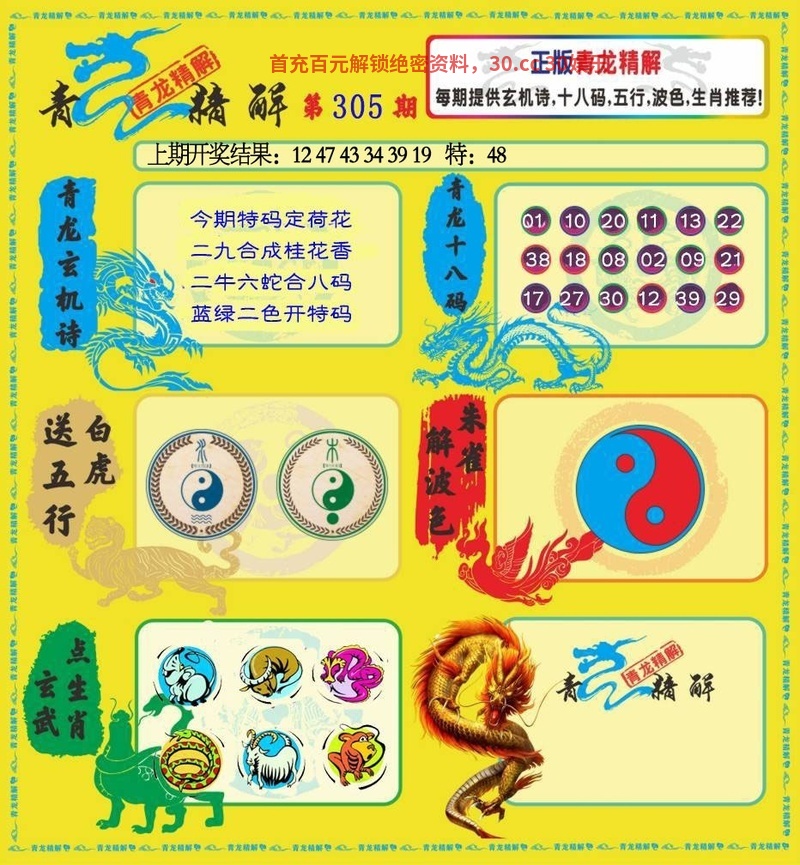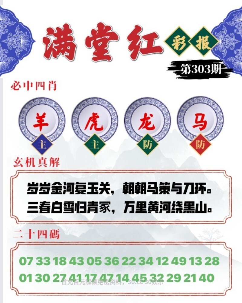 303期满堂红彩报:岁岁金河复玉关,朝朝马策与刀环。三春白雪归青冢,万里黄河绕黑山。 六肖:鼠龙虎兔马鸡 |